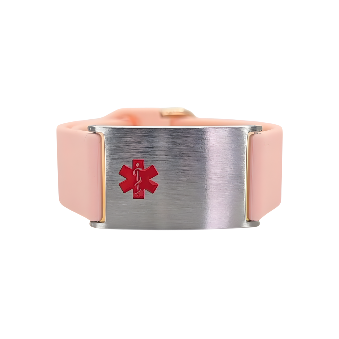 Brazalete de silicona deportivo 20 mm rosado claro con placa en acero inoxidable y símbolo rojo. Un brazalete de identificación médica habla por usted en una emergencia cuando usted no puede, lo que permite a los socorristas evaluar adecuadamente la situación y cómo tratarlo adecuadamente.