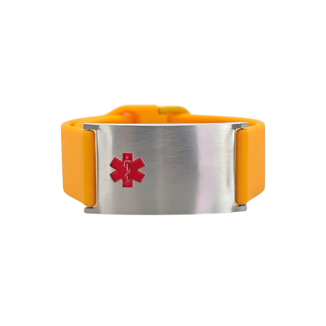 Brazalete de silicona deportivo 20 mm amarillo con placa en acero inoxidable y símbolo rojo. Un brazalete de identificación médica habla por usted en una emergencia cuando usted no puede, lo que permite a los socorristas evaluar adecuadamente la situación y cómo tratarlo adecuadamente.