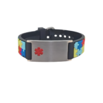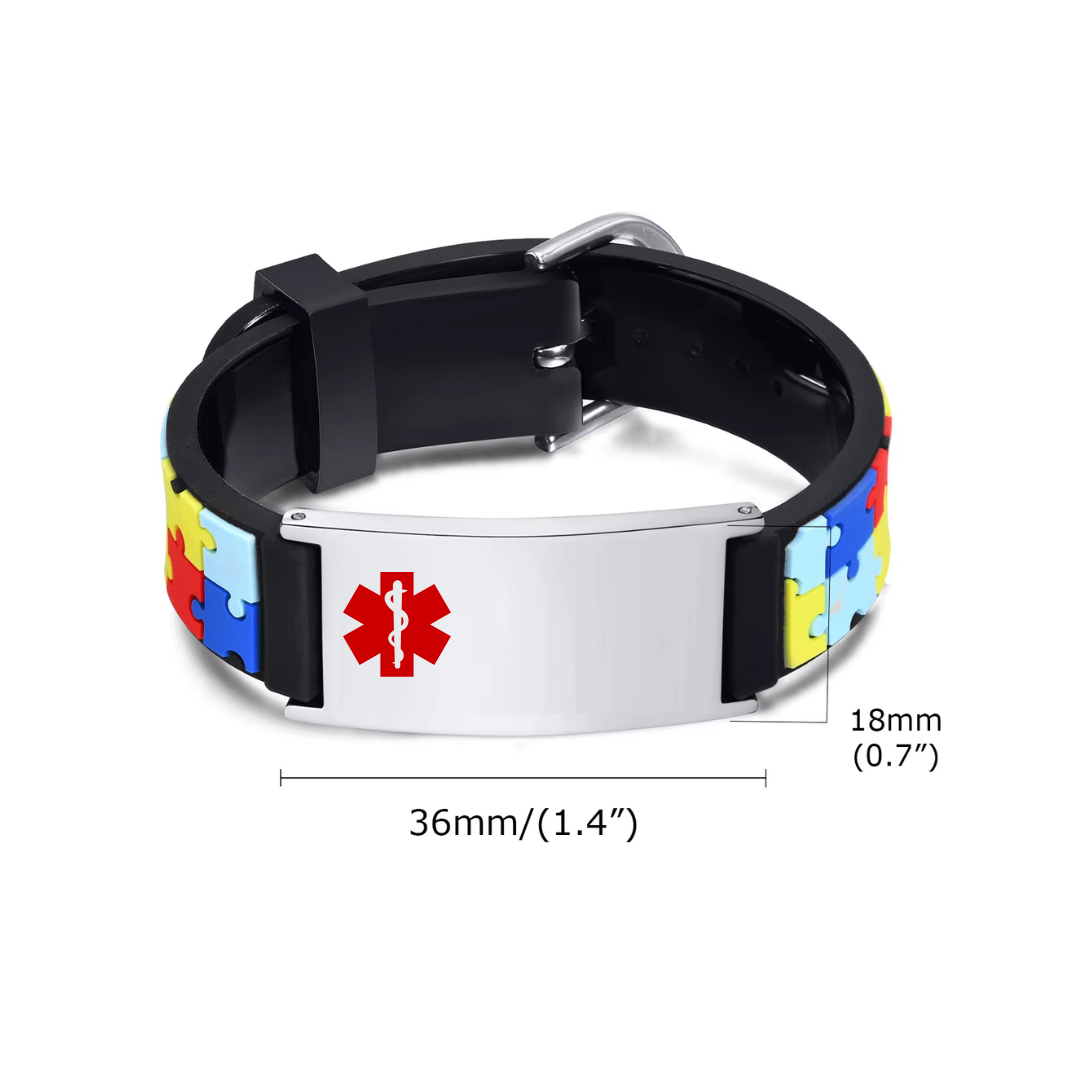 Pulsera de identificación médica de silicona personalizable con placa de identificación de acero inoxidable. Estas pulseras están diseñadas para mostrar de forma segura información vital como condiciones médicas, alergias o contactos de emergencia para el personal de primera respuesta.