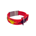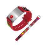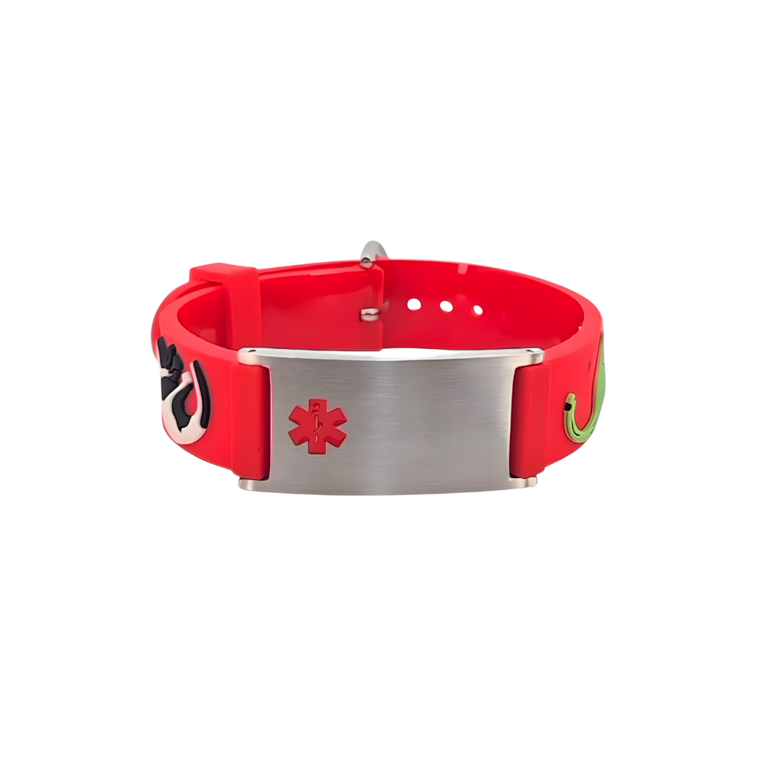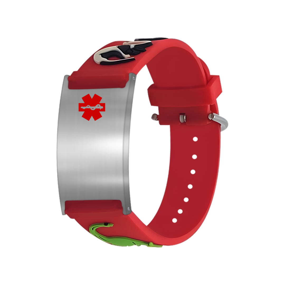 Pulsera infantil con diseño de dinosaurio rojo ¡Una pulsera que tu hijo querrá usar! Esta pulsera presenta: Banda ajustable de PVC sin látex de 1/2″ de ancho con fácil ajuste. Se adapta a tamaños de muñeca de 5 a 6 1/2 pulgadas. Sin níquel, sin plomo y sin látex. Placa médica de acero inoxidable con rojo Símbolo médico.