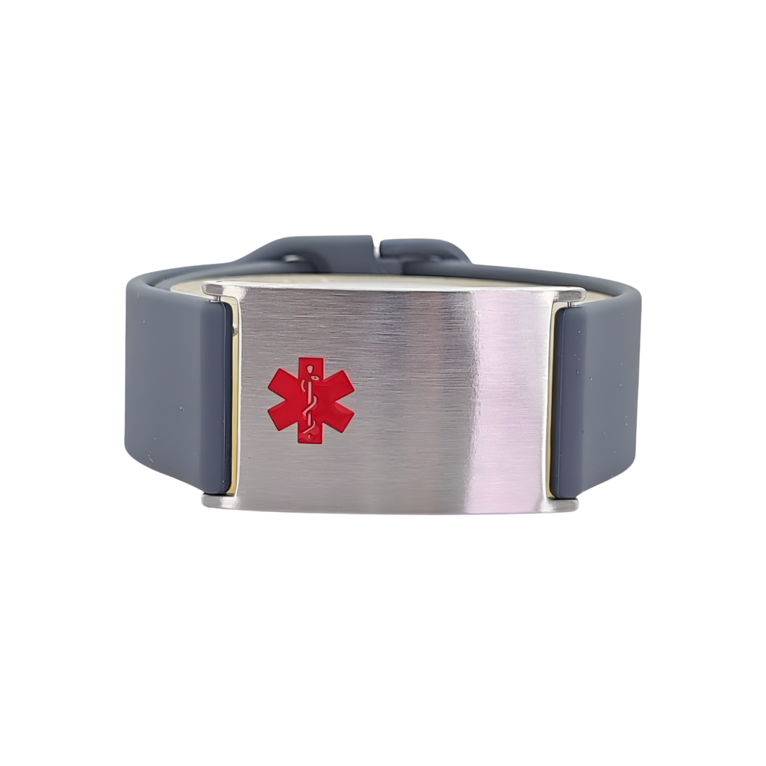 Brazalete de silicona deportivo 20 mm gris estrellado con placa en acero inoxidable y símbolo rojo. Un brazalete de identificación médica habla por usted en una emergencia cuando usted no puede, lo que permite a los socorristas evaluar adecuadamente la situación y cómo tratarlo adecuadamente.